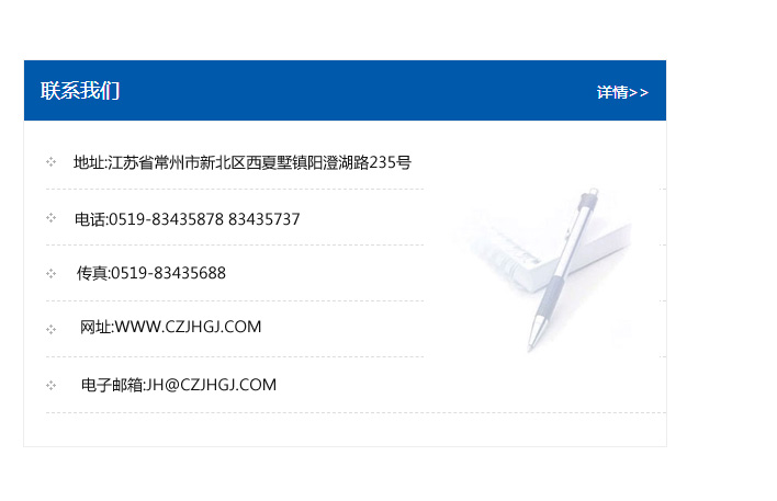 傳真:0519-83435688    郵編:213135    網址:WWW.czjhgj_com.zonoon.com    電子郵箱:JH@czjhgj_com.zonoon.com